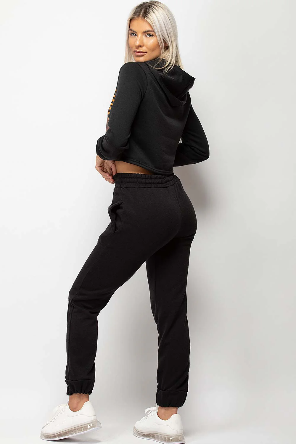 This black cropped hoodie will get you into this casual wear trend effortlessly. Featuring black sweatshirt material with couture graphic print, cropped length and hooded. Style it with joggers or jeans to complete the cool casual look.