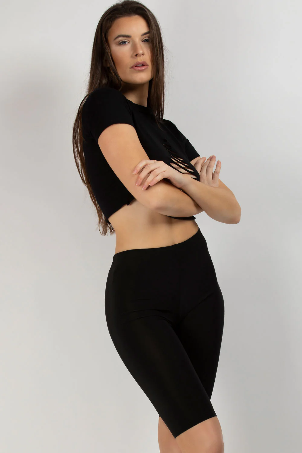 These high waisted cycling shorts are a must have for every wardrobe. Featuring black slinky stretch fabric, elasticated high waist, figure hugging fit. Style it with our cute crop tops or bodysuits to complete the look.