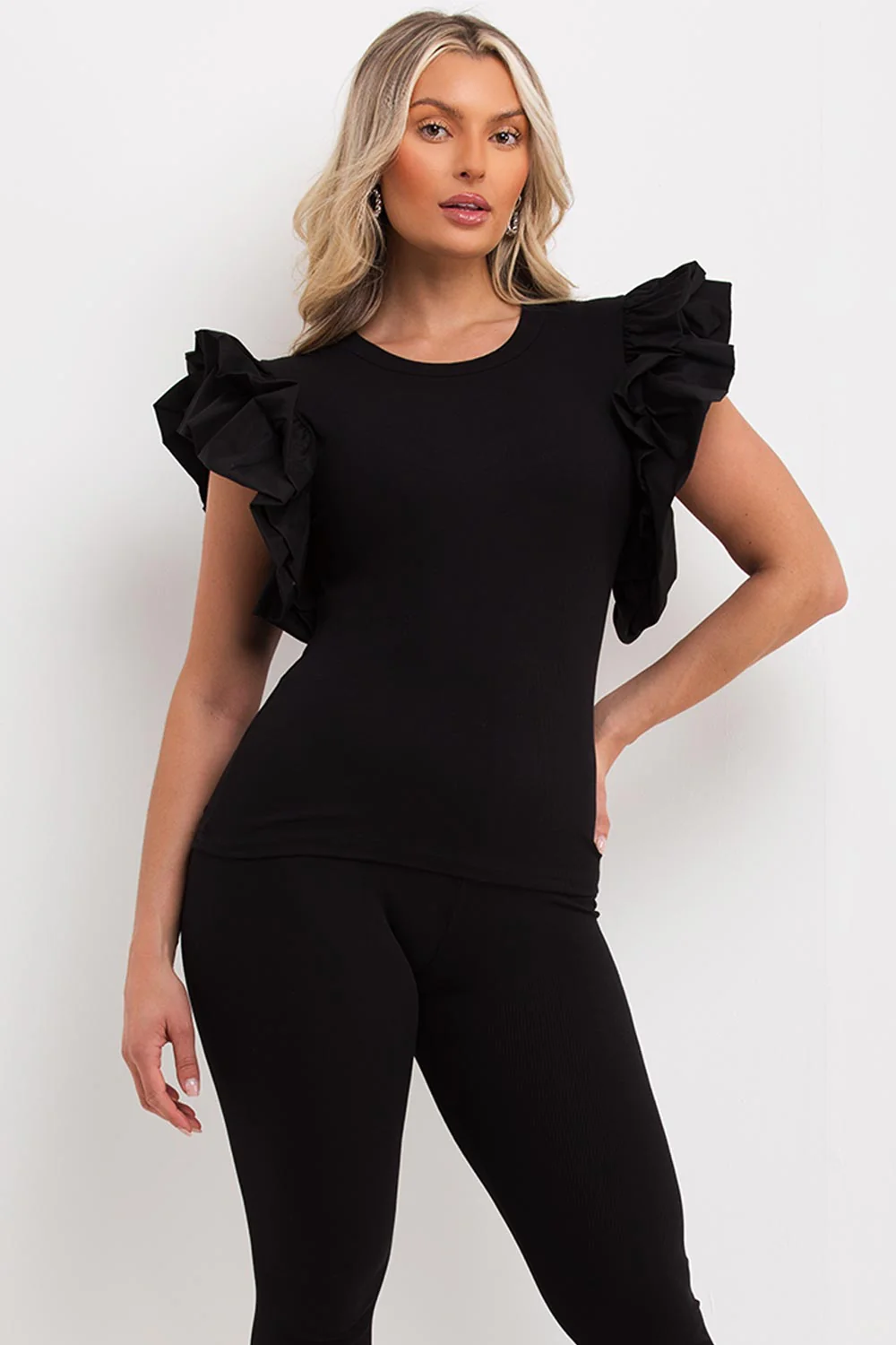 Co ord set with ruffle frill sleeves. Obsessed with this two piece co ord set, perfect outfit for day out shopping or brunch with your bestie. Featuring ruffle frill detail ribbed top with matching high waisted leggings. Style this set with matching accessories to complete the look we are in love with. Also available in other colors.