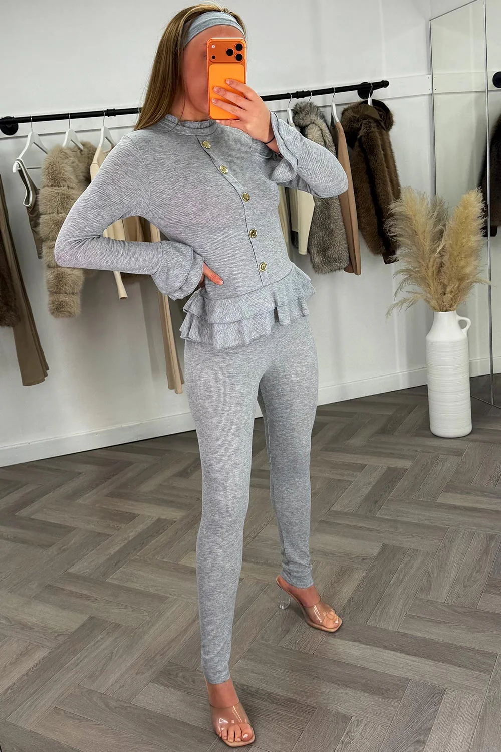 Grey frill detail button front ribbed loungewear two piece set. Featuring ribbed stretch fabric, peplum frill hem and long sleeves with frill cuffs, mock button detail with matching elasticated waist trousers. Perfect outfit for them off duty days. Also available in other colours.