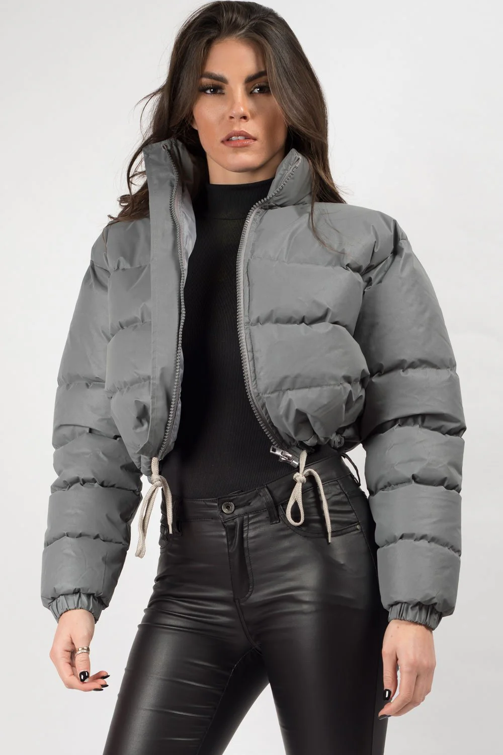 Reflective jackets are becoming must have for your AW wardrobe. This reflective puffer jacket features cropped length, highly reflective grey fabric, zip fastening and drawstrings. Style it with our high waist jeans or with a dress for your next party. Also available in BLACK.