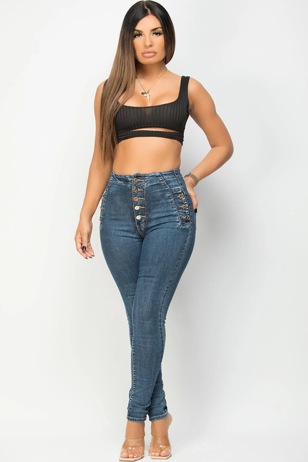 High waisted jeans in denim blue mid wash with gold button detail. Featuring skinny high waisted jeans, stretch denim fabric and elegant gold button detail. Style it with our cute tops to complete the look.