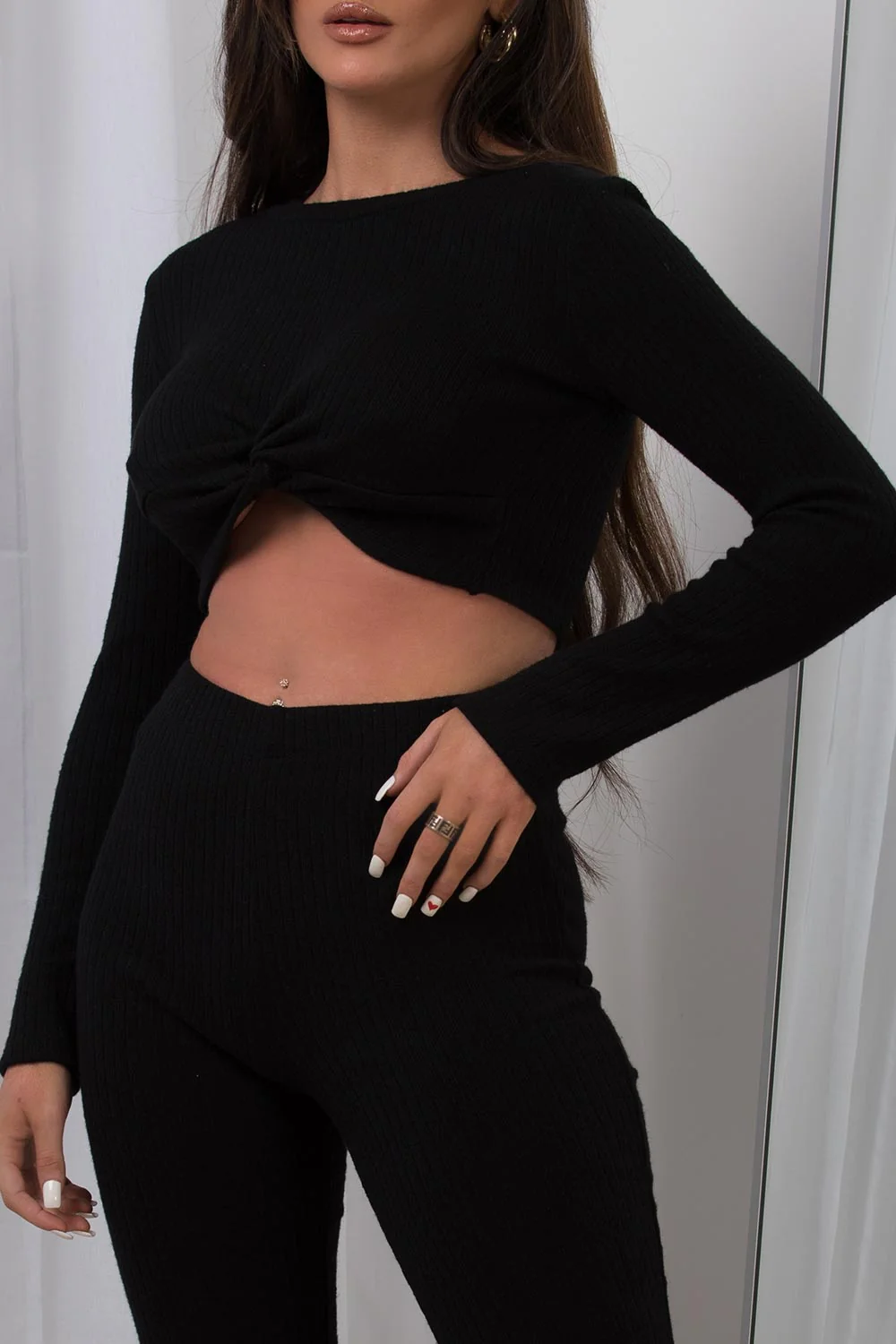 Loungewear set with knot front. This lounge set is going to give you fully chilled out look. Featuring fine rib stretch fabric long sleeve top with knot detail and matching high waist wide leg trousers. Style it with chunky trainers to complete the luxe look. Also available in other colors.