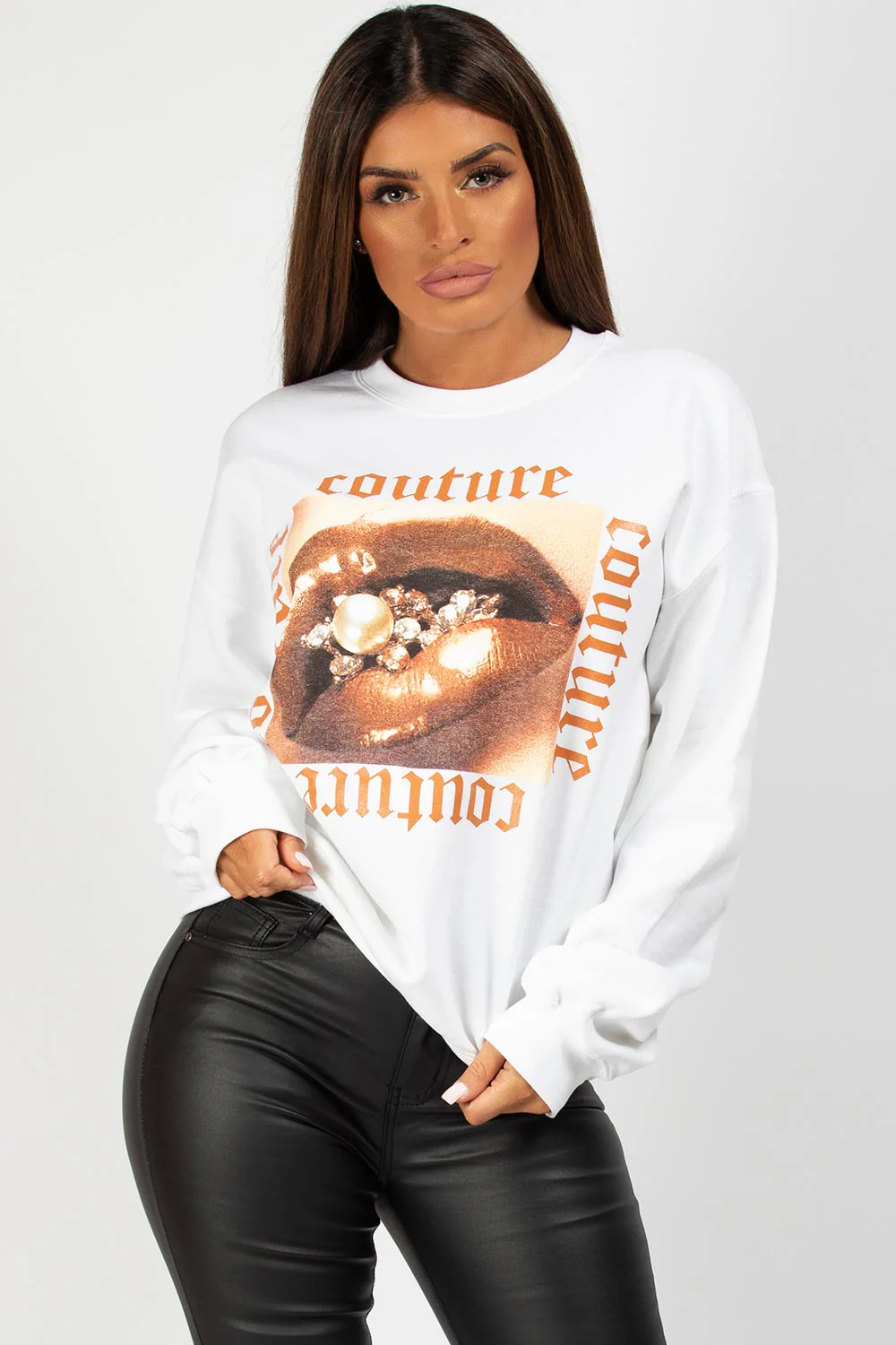 This couture slogan sweatshirt will give you effortless chilled vibe on-point look day or night. Featuring white sweat fabric, couture graphic slogan and oversized fit. Style it with jeans or joggers and fresh kicks for next level looks.