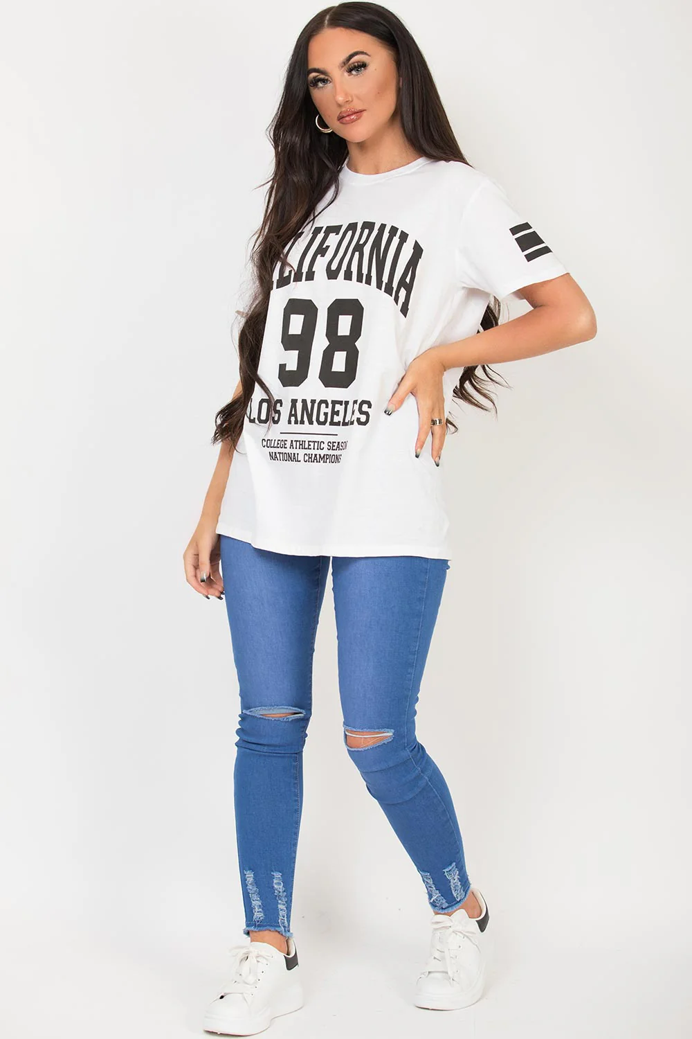 Oversized t shirt with California Los Angeles slogan. This t shirt is perfect to complete any casual look for them off duty days. Featuring oversized tee shirt with short sleeves round neckline and california print. Wear it with our high waisted jeans to complete the look. Also available in other colours.